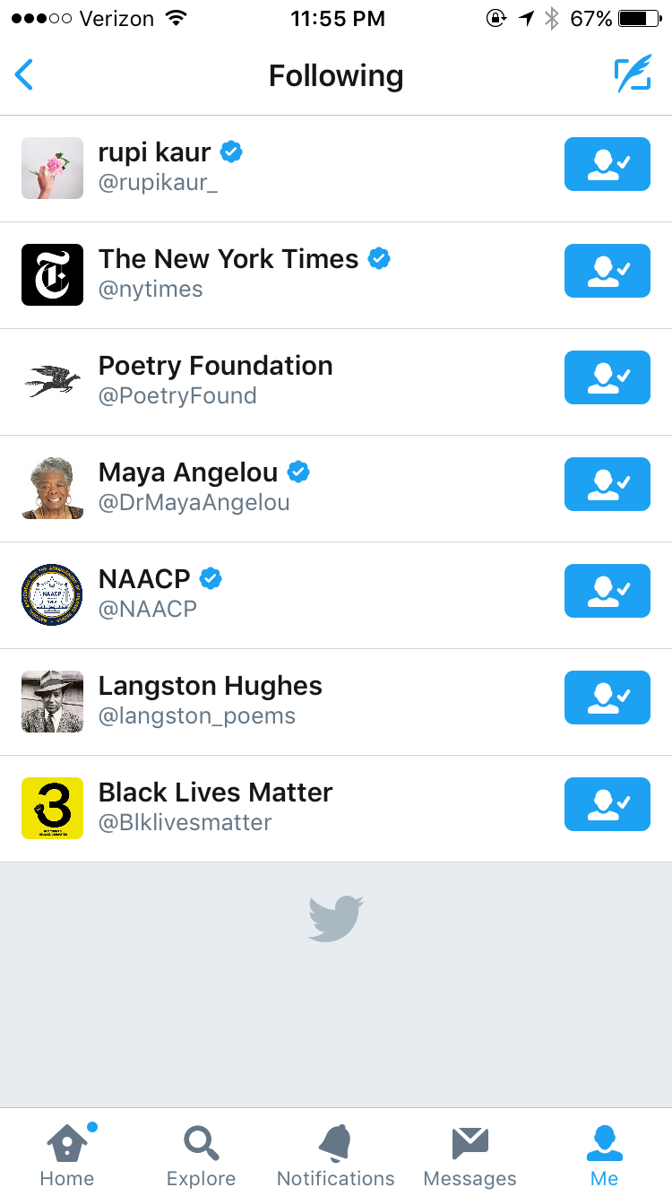 I had Jackie follow a few poets (Langston Hughes, Maya Angelou, and modern poet Rupi Kaur). I thought her love for words would certainly flow out into her social media presence, meaning she would need to follow such people to drink in as many words and stories as she could. I also had her follow Black Lives Matter, the NAACP, and the NY Times. Jackie's maturity and receptiveness of the situations around her are what I think made her so special. I wouldn't think it out of character for Jackie to remain informed and involved.